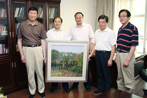 7月1日,在中国共产党建党90周年之际,民革省委副主委殷志强代表民革江苏省委来到中共江苏省委统战部,热烈祝贺中国共产党90华诞,表达对中国共产党的崇高敬意,并赠送民革党员、江苏省美术馆著名油画家庄重创作的油画《家园》,以示祝贺。作品充分寓意美丽的祖国,和谐的盛世,多彩的家园。中共江苏省委统战部副部长周和平感谢民革省委的盛情,对油画《家园》给予很高的评价。(文/雷中 图/刘宁)