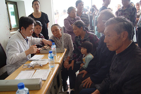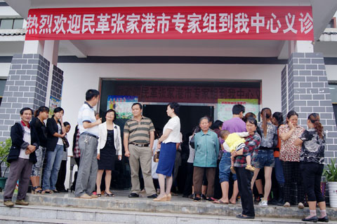 在阳长镇党政负责人陪同下,专家组一行深入阳长镇乐丰保意卫生服务中心(中心由民革张家港市总支捐资100万元于2011年10月建成启用),不顾旅途劳顿,立即投入到紧张的工作中,耐心地为每位群众把脉、询问病情,详细检查。每位专家在义诊的同时,负责带教1至2名医生。前来咨询就诊的当地群众冒着大雨,络绎不绝,义诊活动持续到下午2点才结束,本次活动共为200多名当地群众进行了义诊,并向卫生服务中心捐赠价值1万元药品。