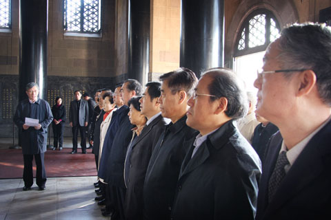 上午9时,各界人士在博爱坊前合影留念,随后拾级登上陵顶祭堂。各界人士在中山先生坐像前肃立,行鞠躬礼。江苏省人大常委会副主任丁解民、南京市人大常委会副主任许惠玲代表省、市人大,江苏省政府副省长傅自应、南京市政府秘书长魏克代表省、市政府,江苏省政协副主席周珉、南京市政协副主席刘建代表省、市政协,中共江苏省委统战部副部长马连美、中共南京市委统战部副部长李跃芝代表省、市委统战部,民革江苏省委副主委殷志强、民革南京市委副主委袁策代表省、市民革分别向中山先生坐像敬献了花篮。省政协副主席、民革江苏省委主委程崇庆主持谒陵仪式。接着,各界人士绕灵寝一周,深切缅怀孙中山先生的不朽业绩。