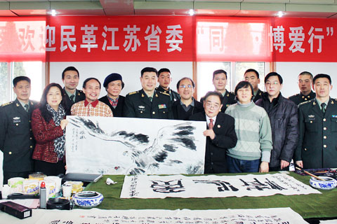 元月14日,民革江苏省委副主委殷志强率领民革书画艺术家前往连云港警备区海岛部队开展“同心•博爱行”艺术家团进军营慰问活动。民革中央画院理事欧锦钺、何鸣、于文清,省直民革党员范遵荣,南京市民革党员欧锦铭5位书画家参加了慰问活动。省政协委员、江苏省国画院山水画研究所所长杨耀宁向部队官兵赠送了书画作品。民革省委联络处处长任晓红参加了活动。