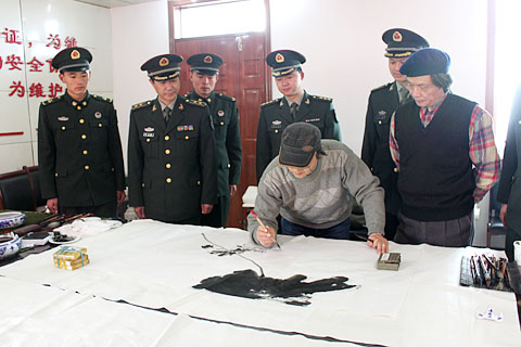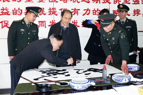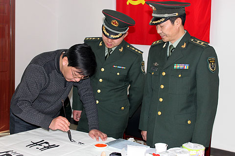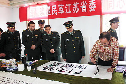 当天,慰问团一行在部队领导陪同下,参观了连史馆,了解了该连队的光荣历史,在举行简短的座谈会后,书画家们即现场挥毫泼墨,精心创作出30余幅书画作品,讴歌人民军队的丰功伟绩,表达军民鱼水情深,彰显了亲如一家的军民关系。并将这些作品赠予守岛的官兵们。民革省委还向官兵们赠送了水写字帖、毛笔和部分书法教程。