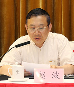 赵波宣读了民革中央副主席、省政协副主席、民革省委主委程崇庆发来的贺词。程崇庆副主席在贺词中指出,本次会议以促进祖统、社会服务工作为主题,总结经验,交流情况,研究问题,很有必要。促进祖国和平统一工作是民革的特色工作、重点工作。我省民革各级组织以中央对台工作方针政策为指导,紧紧抓住两岸和平发展难得的历史机遇,以台情研究为基础,以涉台参政议政为重心,以特色交流为手段,创新工作思路,为促进祖国统一发挥了独特作用。我省民革的社会服务工作成绩突出,特别是“同心博爱行”活动,亮点众多。时代在前进,形势在发展。我们民革的各项工作也面临着新的机遇,同时也面临着许多挑战。希望同志们重视政策和理论的学习,按照中央和省委的部署,不失时机,再接再厉,不懈努力,探索各种富有时代特点的新方法、新举措,不断提升我们的工作水平,在祖统工作和社会服务工作方面做出新的更大的成绩!
