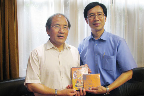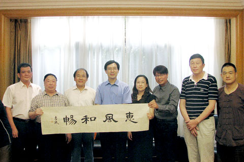 9月4日中午,民革省委副主委殷志强在南京接待台湾新竹县民意代表、两岸艺文产经交流协会理事长、新竹县立交响管乐团团长郭远彰等一行,双方就两岸民间文化、艺术、宗教等共同关心的话题进行深入探讨,并就如何保护利用好南京天妃宫文物资料、加强两岸文化交流交换了意见,双方还互赠书籍及书法作品。