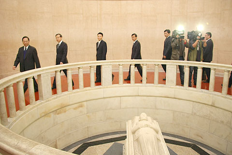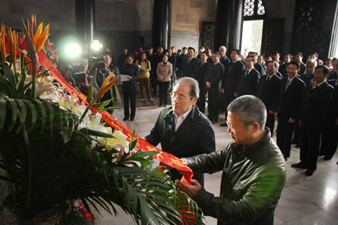 上午9时,各界人士在博爱坊前合影留念,随后拾级登上陵顶祭堂。各界人士在中山先生坐像前肃立,行鞠躬礼。江苏省人大常委会副主任公丕祥、南京市人大常委会副主任李琦代表省、市人大,江苏省政府副省长傅自应、南京市政府副市长胡万进代表省、市政府,江苏省政协副主席何权、南京市政协副主席陆平贵代表省、市政协,中共江苏省委统战部部务委员陶勇、中共南京市委统战部副部长毛卫华代表省、市委统战部,民革江苏省委副主委殷志强、民革南京市委主委邹建平代表民革省、市委,分别向中山先生坐像敬献花篮。接着,各界人士绕灵寝一周,深切缅怀孙中山先生的不朽业绩。民革江苏省委副主委陈星莺主持谒陵仪式。