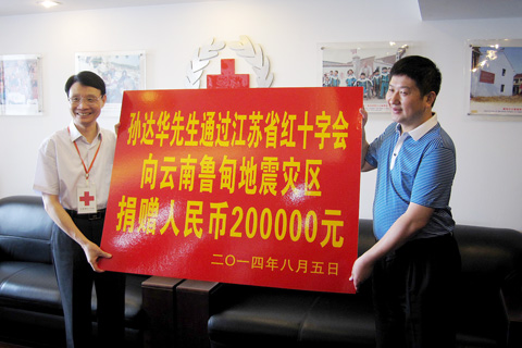8月5日,云南鲁甸地震灾害发生后,民革江苏省委常委、江苏省绿溢集团董事长、爱心企业家孙达华通过江苏省红十字会,在第一时间以个人名义向灾区捐献20万元。坚持把慈善当成一种事业来做,每当遇到自然灾害,孙达华都会自愿带头捐款。多年来,累计捐款、捐物价值3000多万元人民币,诠释了一个企业家心系社会的博爱情怀。(宣传处)