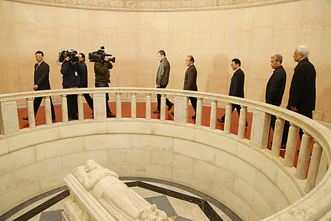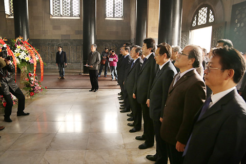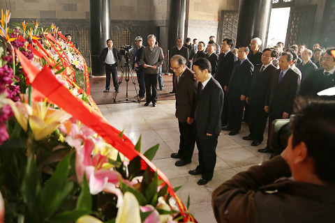 上午9时,参加拜谒的各界人士在博爱坊前合影留念。随后,大家拾级登上陵顶祭堂,在中山先生坐像前肃立,行鞠躬礼。江苏省人大常委会副主任赵鹏、南京市人大常委会副主任单景南代表省、市人大常委会,江苏省政府副省长傅自应、南京市政府副市长胡万进代表省、市人民政府,江苏省政协副主席杨新力、南京市政协副主席鲍永安代表省、市政协,中共江苏省委统战部部务委员陶勇、中共南京市委统战部副部长李跃芝代表省、市委统战部,民革江苏省委副主委殷志强、民革南京市委副主委薛国安代表省、市民革,分别向中山先生坐像敬献花篮。接着,各界人士绕灵寝一周,深切缅怀孙中山先生的不朽业绩。省政协副主席、民革江苏省委主委程崇庆主持谒陵仪式。