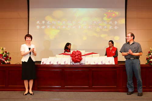 8月20日下午,民革无锡市委纪念抗日战争胜利70周年大会在无锡市民中心举行。20余名抗战老兵及部分已故老兵亲属代表、社会各界嘉宾、无锡民革党员参加了大会。江苏省政协副秘书长、民革江苏省委副主委殷志强,无锡市政协副主席、民革无锡市委主委张丽霞,中共无锡市委统战部副部长唐英彪,中共无锡市委台办副主任张曙峰,无锡市政协研究室主任雷群虎、学习与理论研究委员会主任丁坚,民革无锡市委副主委王晋、姜科等出席本次活动。