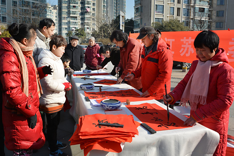 在时光澔韵小区市民广场,闻讯赶来的居民们将活动现场围得水泄不通。大红的宣纸、浓浓的墨香点燃了居民的热情,也点燃了活动现场书法家们的激情,大家被一幕幕年味十足的幸福画面感动着。范遵荣、张蔚星、罗明兰、邹宁四位书法家不辞辛苦,应居民们的要求挥毫泼墨、奋笔疾书,为他们送去了新春的祝福。社区居民为求一副对联,顶着凛冽的寒风从四面八方赶来,一个个笑逐颜开,挑选着寓意幸福美好的对联,一时间,民革送春联成了居民们争相抢要的新年礼物。当日上午,预先准备和现场书写的400多幅春联被市民们一抢而空。