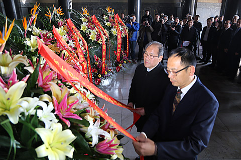 上午9时整,各界人士从中山先生手书“博爱”坊出发,沿宽阔墓道,攀392级台阶,穿陵门、碑亭,抵达祭堂。在民革江苏省委副主委张坚勇主持下,江苏省人大常委会副主任赵鹏、南京市人大常委会副主任单景南代表省、市人大常委会,江苏省政府副秘书长陈少军、南京市政府副市长胡万进代表省、市人民政府,江苏省政协副主席范燕青、南京市政协副主席吴卫国代表省、市政协,中共江苏省委统战部副部长瞿超、中共南京市委统战部部务委员汤雯代表省、市委统战部,民革江苏省委副主委殷志强、民革南京市委副主委王真理代表民革省、市委,分别向中山先生坐像敬献花篮。敬献花篮后,各界人士向中山先生坐像行三鞠躬礼,随后依次步入圆堡形墓室,静肃,缓缓绕中山先生灵柩一周。